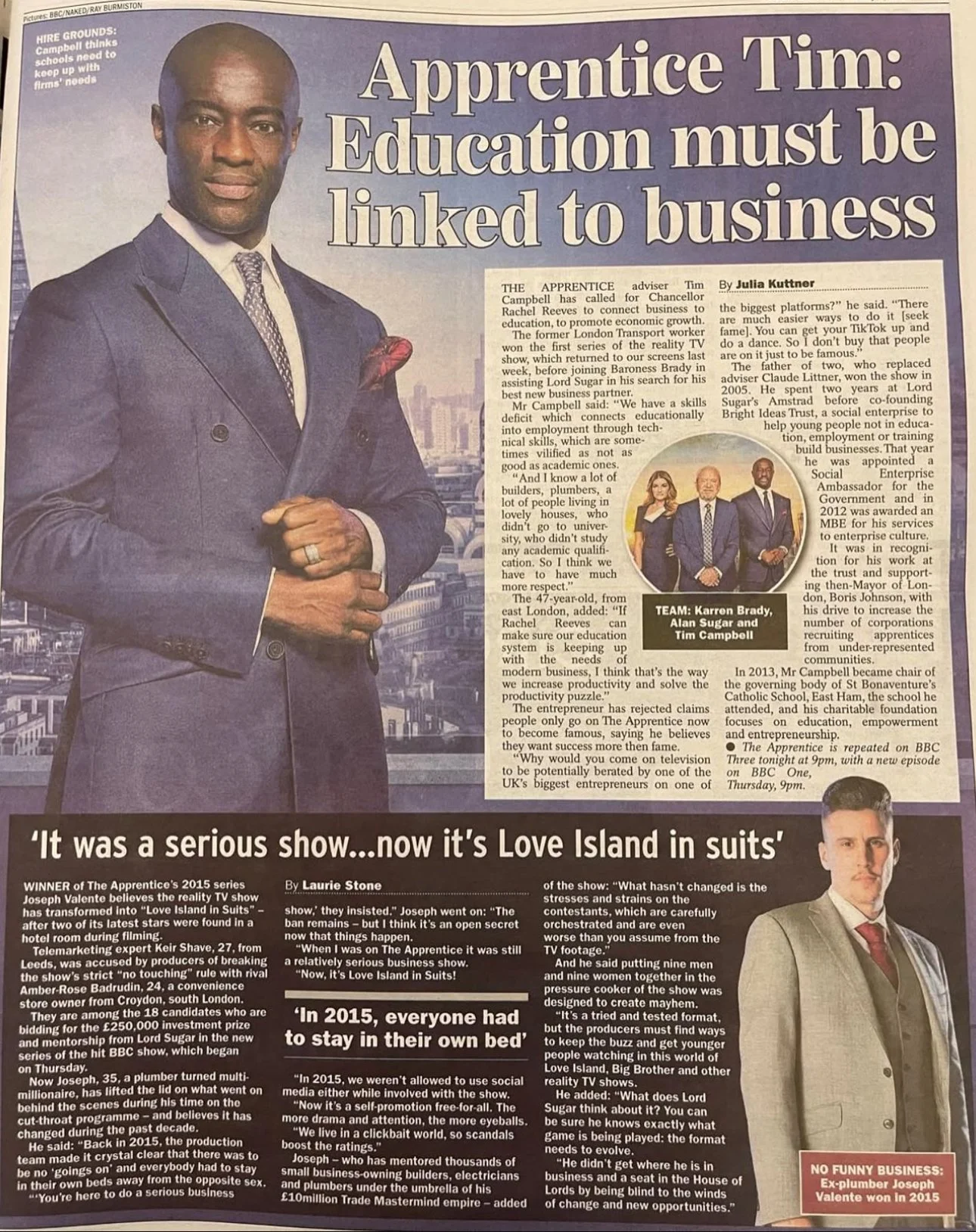 Brilliant client Joseph Valente is back in the news as the 19th series of the BBC1 show, The Apprentice, is back on TV. The Sunday Express featured describing the new series as: Love Island in suits.